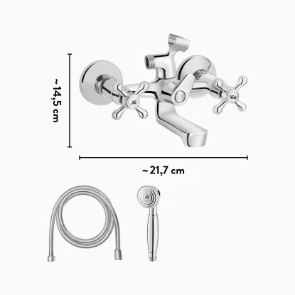 Du möchtest ein Badezimmer im Landhausstil? Dann wird dir die baliv Wannenarmatur WA-5040 im Retro-Design bestimmt genauso gut gefallen wie deiner Familie. Die Kreuzgriffe fallen dabei sofort ins Auge. Mit ihnen kannst du nicht nur Kalt- und Heißwasser separat regulieren, sie sind auch mit einer nostalgisch verschnörkelten Schrift entsprechend gekennzeichnet. Die Handbrause mit ihrem glockenförmigen Brausekopf und ihrem stilvollen Handgriff runden das charmante Vintage-Design perfekt ab. Dank des Umstellers entscheidest du im Handumdrehen, ob du lieber mit einer Dusche oder einem Bad den Tag ausklingen lassen möchtest. Warum nicht passend zum Landhausflair ganz romantisch im Kerzenschein?