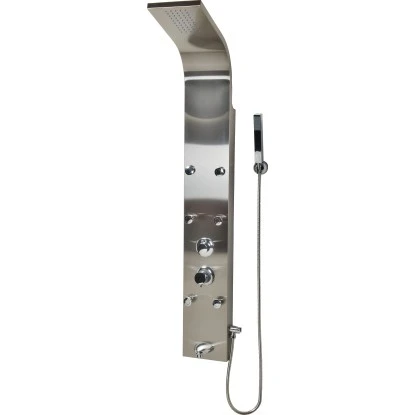 Das Eisl Duschpaneel Vital verfügt über eine Kopfbrause, eine Handbrause, sechs Rückendüsen und einen Wanneneinlauf. Es besteht aus schickem Edelstahl mit verchromten Dusch-Armaturen und Düsen.