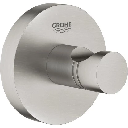 Der Grohe Essentials Bademantelhaken in der Farbvariante Supersteel ist auf einer runden Platte positioniert ist.