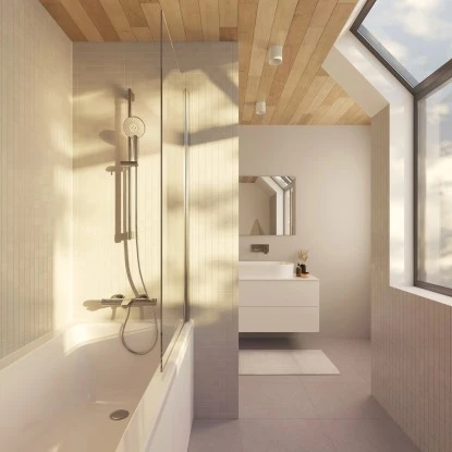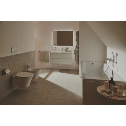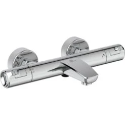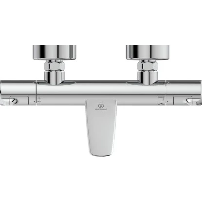 Das Ideal Standard Badethermostat Ceratherm T50 überzeugt durch wegweisende Technologie in Verbindung mit einem besonders schlanken Armaturenkörper. Die von Grund auf neu entwickelte FirmaFlow-Thermostatkartusche bietet kurze Reaktionszeiten und sichere Performance. Dank ihres kompakten Aufbaus verfügen alle CeraTherm T Thermostate über die Cool Body Technologie, die ein Aufheizen des Thermostatkörpers unterbindet. Die separat erhältliche Ablage zum Aufklipsen sorgt für zusätzlichen Stauraum. Besonders elegant sind auch die neuen CeraTherm T Duschsysteme aus dem Idealrain Programm. Das Badethermostat von Ideal Standard verfügt über einen Luftsprudler und Rückflussverhinderer. Durch das 2-Wege-Ventil kann zwischen Brause und Wanne umgeschaltet werden. Die RV Patrone auf der Warmwasserseite mit integriertem Überdruckventil dient zur Druckentlastung.