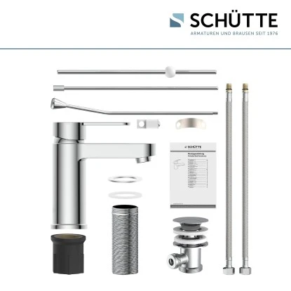 Die Schütte Waschtischarmatur Elephant Chrom verbindet ausgetüfteltes Design und die einzigartige Funktionalität . Die hochwertige Verchromung und die keramischen Dichtungsscheiben sorgen für eine lange Lebensdauer und für präzise Regelung der Durchflussmenge und der Wassertemperatur. Der Luftsprudler arbeitet äußerst geräuscharm. Die komfortable Einhand-Bedienung ermöglicht mehr Bewegungsfreiheit im Waschbeckenbereich. Die Hochdruck-Armatur Elephant verfügt über einen Kalt- und einen Warmwasseranschluss. Zum Lieferumfang gehören zwei Flexschläuche und 11/4 Zoll (Ø ca. 4 cm) Stangen-Exzentergarnitur (Ablaufgarnitur). Mit Hilfe eines kleinen Hebels am Armaturenkörper wird der Auslauf geöffnet oder geschlossen. Das Schnellbefestigungsset und eine deutsche Montageanleitung machen die Installation für Sie zum Kinderspiel. Die Waschtischarmatur Elephant entspricht den Bestimmungen der deutschen Trinkwasserverordnung. Komponenten mit Wasserkontakt sind KTW und W270 geprüft. Strenge Qualitätskontrollen und hochwertige Materialien gewährleisten hohe Sicherheit und beste Wasserqualität.