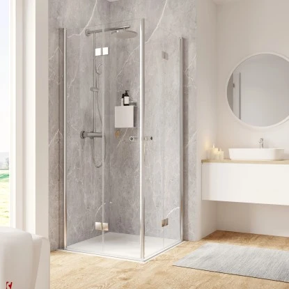 Die Schulte ExpressPlus Drehfalttür Eckeinstieg Garant 2.0 Alu-Natur hat eine Größe von 200 cm x 90 cm x 90 cm und setzt sich aus insgesamt vier 6 mm starken Sicherheitsglas-Elementen (ESG) zusammen. Die beiden Türelemente öffnen über zwei formschöne Griffe über Eck und bieten somit einen großzügigen Einstiegsbereich. Die raumsparende Tür lässt sich einfach zusammenfalten, sodass auch im geöffneten Zustand kein Element in den Raum hineinragt. Dies macht die Drehfalttür zur optimalen Lösung für kleine Bäder. Die eleganten Profile und Anbauteile setzen die Duschtüre zudem optimal in Szene und halten sie sicher in Position.