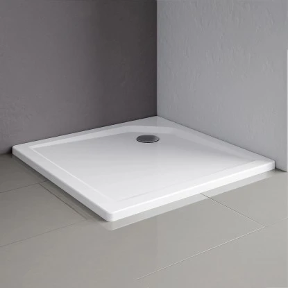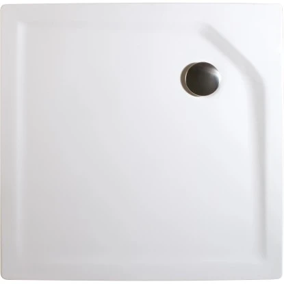 Die extraflache quadratische Duschwanne hat die Maße 90 cm x 90 cm und ist Alpinweiß.
