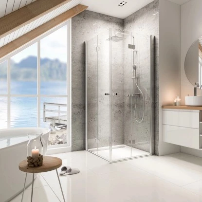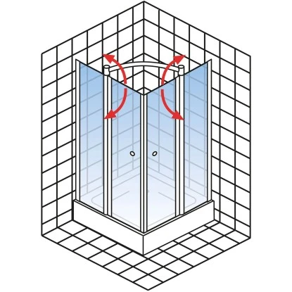 Der Schulte Eckeinstieg mit Drehfalttür Garant ist eine platzsparende und zugleich optisch ansprechende Lösung für kleine Bäder. Die beiden formschönen, nach innen öffnenden Drehfalttüren bilden im geöffneten Zustand einen geräumigen Eckeinstieg, der Ihr Bad zu keiner Zeit räumlich einschränkt.