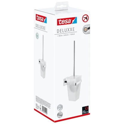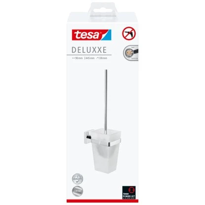 Die Tesa Bad-Artikel der Serie Deluxxe überzeugen durch das exquisite Design in Kombination mit Qualität und Funktionalität. In modernem Chrom gehalten passen sie sich jedem Badezimmer oder Gäste-WC ideal an. Noch dazu sind die praktischen Bad-Artikel rostfrei. Mit der Tesa WC-Bürstengarnitur Deluxxe können Sie Ihre WC-Bürste einfach an der Wand aufbewahren, wo sie nicht beim Wischen und Saubermachen stört. Der Behälter aus Milchglas lässt sich für die einfache Reinigung herausnehmen. Zudem verfügt die im Lieferumfang enthaltene WC-Bürste über einen auswechselbaren Bürstenkopf.