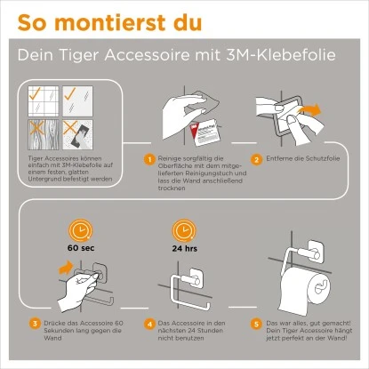 Der Tiger Tune Toilettenpapierhalter verfügt über eine Oberfläche aus gebürstetem Messing mit mattschwarzen Akzenten. Der schwenkbare Toilettenrollenhalter ist mit einer strapazierfähigen 3M-Klebefolie für eine einfache Montage ohne Bohren auf allen glatten, stabilen Untergründen ausgestattet. Sollte die Oberfläche für die Verwendung der selbstklebenden Rückseite ungeeignet sein, kann der WC-Rollenhalter optional mit Schrauben und Dübeln an der Wand montiert werden. Die Serie Tune umfasst eine breite Auswahl weiterer Accessoires für Badezimmer und Toilette, die alle wunderbar zusammenpassen. Durch das klassische Design und die trendigen Oberflächen können die Tiger Tune Accessoires einfach mit jedem Einrichtungsstil kombiniert werden. Die freistehenden und selbstklebenden Accessoires verleihen dem Badezimmer und der Toilette einen ganz besonderen Look.