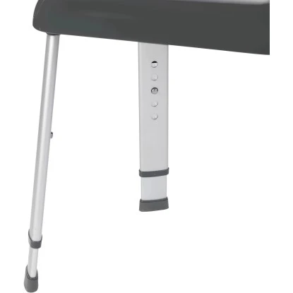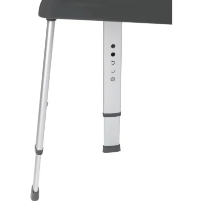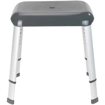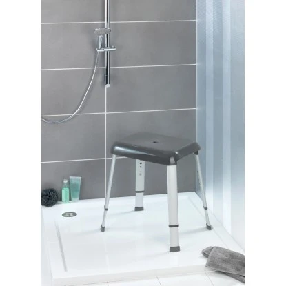 Der Hocker besitzt eine rutschhemmende, strukturierte und extra große Sitzfläche und verstellbare, stylische Aluminium-Füße für eine optimale Sitzposition beim Duschen. Die große Öffnung auf der Sitzfläche ermöglicht einen vollständigen Wasserablauf.